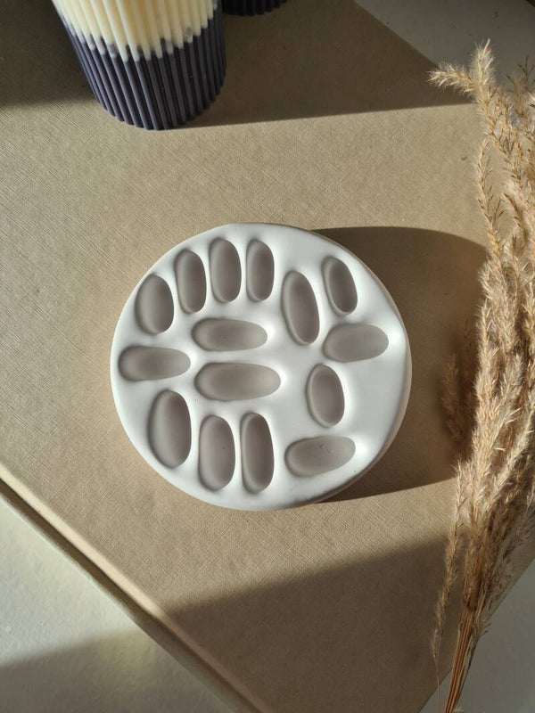 This handcrafted ring holder is made from premium Jesmonite, an eco-friendly and durable material known for its smooth texture and versatility. The aesthetic design features a round base with multiple sections, each tailored to hold and organize your rings with elegance. Its unique structure allows for easy access while adding a modern, artistic touch to any vanity or dresser. The soft, matte finish enhances the contemporary appeal, making it both a practical storage solution and a chic decorative piece. Perfect for keeping your rings safe and stylishly displayed.