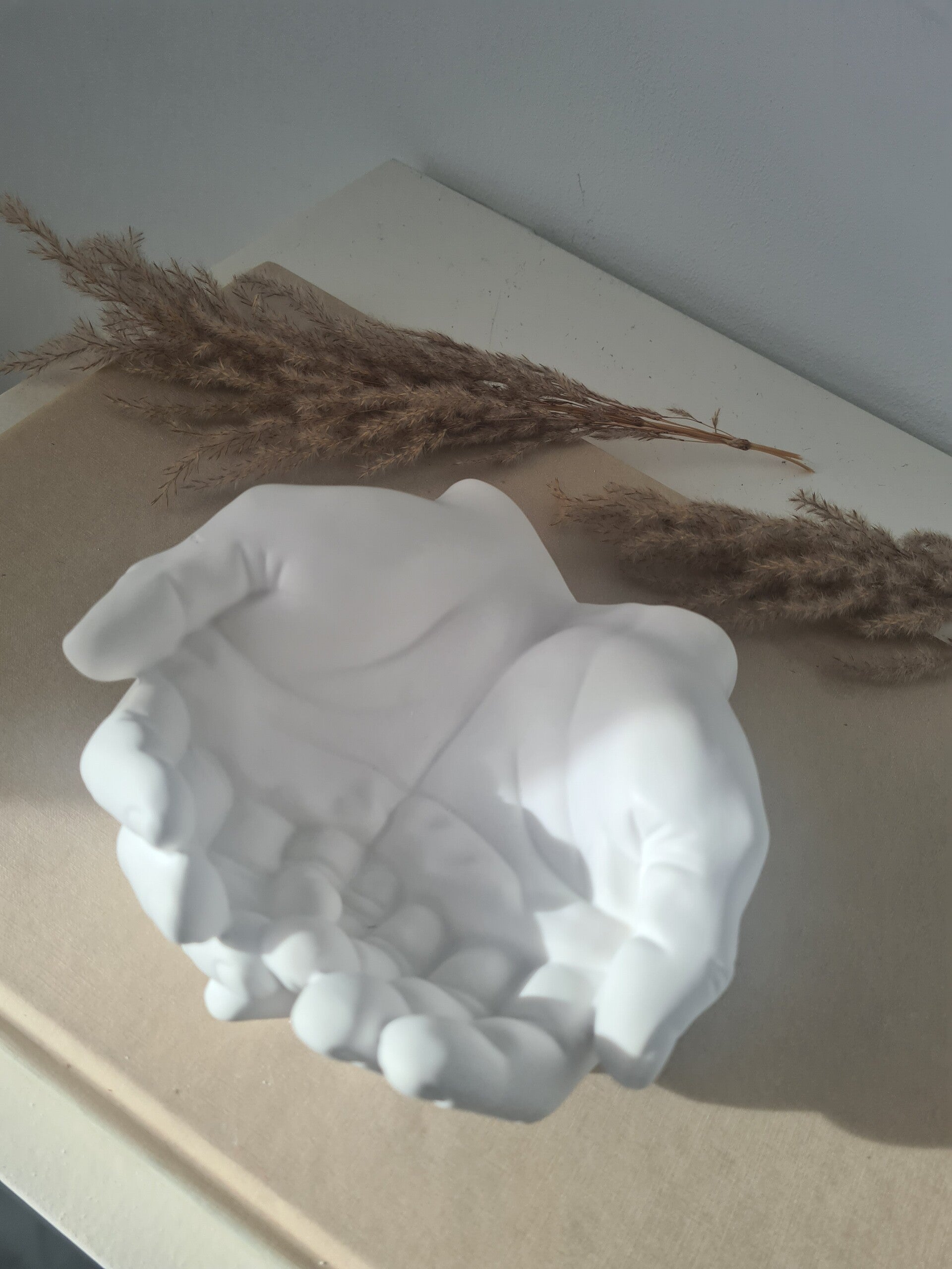 This Praying Hands Candle Holder, made from high-quality Jesmonite, is a beautifully crafted piece designed to hold a single candle. The hands, intricately shaped in a praying pose, create a serene and spiritual ambiance, while the smooth, matte finish adds a contemporary touch. The base is designed to hold sand, offering stability for the candle and enhancing the overall aesthetic. Perfect for creating a calming atmosphere in any room, this unique piece is ideal for those seeking both beauty and functionality in their decor. A stunning blend of artistry and practicality for your home.